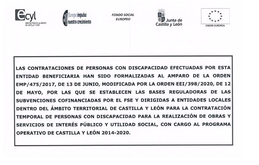 Dicha subvención, cofinanciada por el FONDO SOCIAL EUROPEO, va destinada exclusivamente a la contratación temporal de personas con discapacidad para la realización de obras y servicios de interés público y utilidad social.